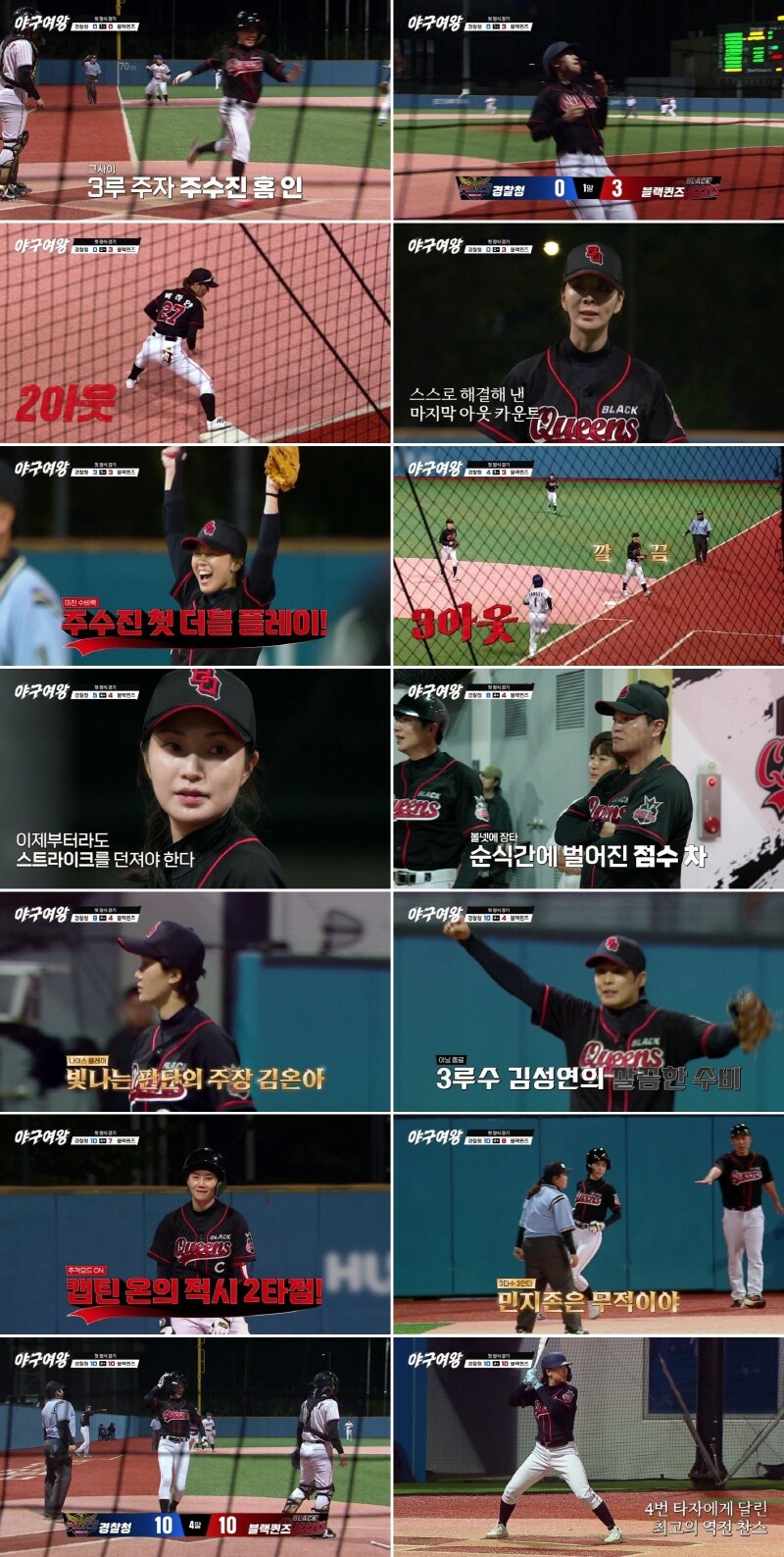 지난 9일 방송한 채널A 스포츠 예능 ‘야구여왕’ 3회에서는 ‘레전드 선출’ 김민지-김보름-김성연-김온아-박보람-박하얀-송아-신소정-신수지-아야카-이수연-장수영-정유인-주수진-최현미가 뭉친 국내 50번째 여자 야구단 블랙퀸즈가, 올림픽·아시안게임 메달리스트들이 포진한 경찰청 여자 야구단과 첫 정식 경기를 치르는 현장이 생생히 펼쳐졌다.