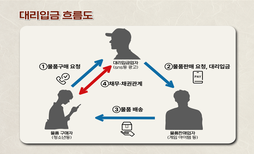 불법 ‘대리입금’이란 청소년을 대상으로 SNS 등을 통해 주로 10만 원 내외의 게임 아이템 구입비, 연예인 굿즈나 콘서트 티켓 구입비 등을 대신 납부해 주고 ‘수고비’·‘지각비’를 부과하는 불법 대부 행위이다.