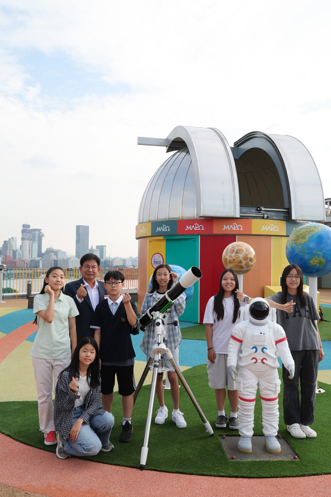 | 마포365천문대에서 박강수 마포구청장과 어린이들이 기념촬영을 하고 있다. [사진=마포구] |