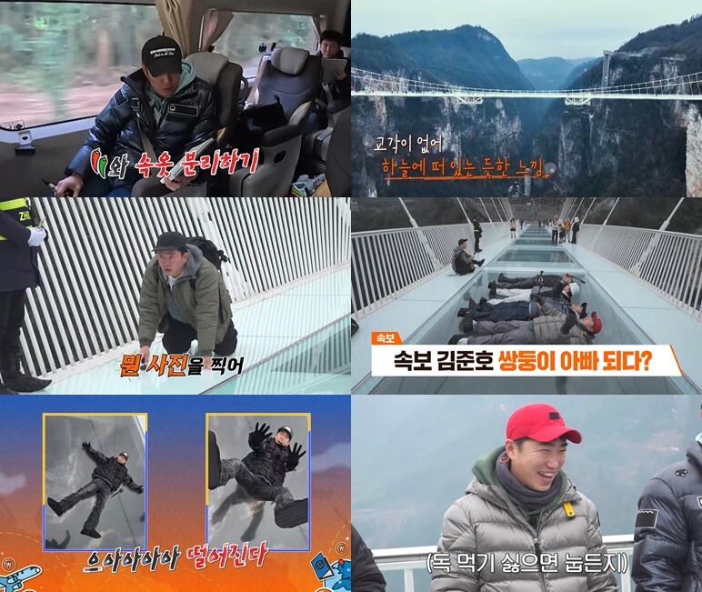 그러던 중 홍인규는 “이 다리 위에서 사진을 남겨야 진정한 남자”라며 유리 다리 위에 다 같이 누워서 인생샷을 찍자고 말한다. 이에 김준호는 “너희들끼리 찍어”라며 ‘얼음’이 되는데, 홍인규는 “보여줘~, 쌍둥이 아빠!”라고 그를 독려해 모두를 놀라게 한다. 김준호의 2세를 쌍둥이로 예언한 홍인규의 발언에 김준호는 “너 때문에 자꾸 가짜뉴스 나잖아!”라며 황당함에 혀를 내두른다. 과연 김준호가 세계에서 가장 긴 유리 다리를 무사히 건널 수 있을지, 그리고 아찔한 단체 인생샷도 찍을 수 있을지 관심이 쏠린다.
