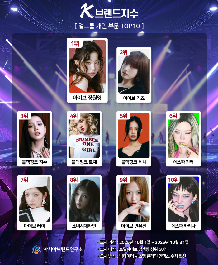 이번 K-브랜드지수 걸그룹 개인 부문은 포털사이트 검색량 상위 50인을 대상으로, 2025년 10월 1일부터 10월 31일까지의 온라인 빅데이터 6억 8864만 1587건을 분석했다.