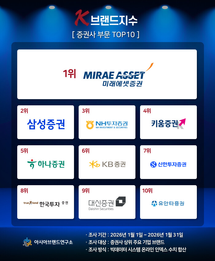K-브랜드지수 증권사 부문은 1위 미래에셋증권에 이어 삼성증권(2위), NH투자증권(3위), 키움증권(4위), 하나증권(5위), KB증권(6위), 신한투자증권(7위), 한국투자증권(8위), 대신증권(9위), 유안타증권(10위) 등이 TOP10에 이름을 올렸다.