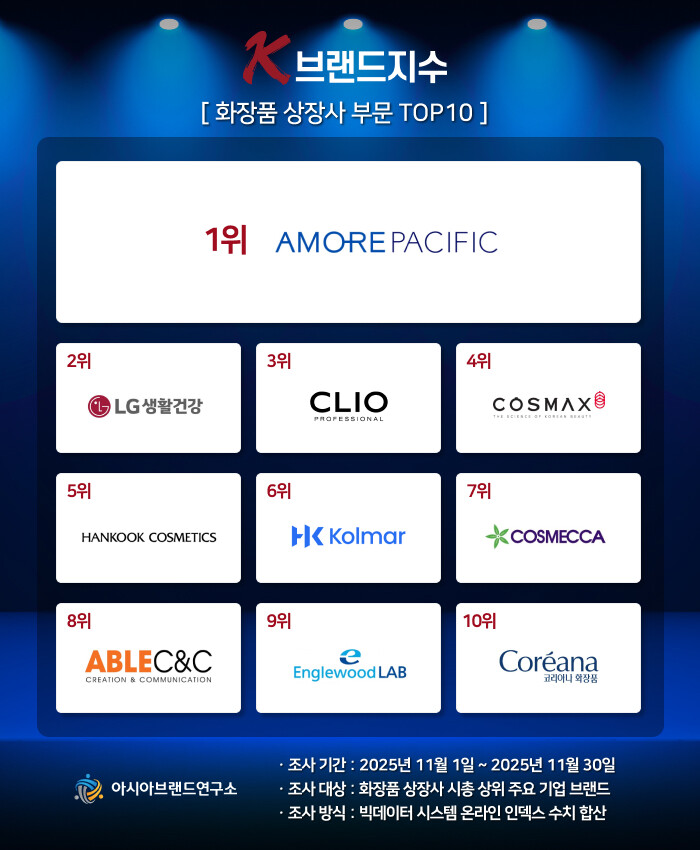 K-브랜드지수 화장품 상장사 부문은 1위 아모레퍼시픽에 이어 LG생활건강(2위), 클리오(3위), 코스맥스(4위), 한국화장품(5위), 한국콜마(6위), 코스메카코리아(7위), 에이블씨엔씨(8위), 잉글우드랩(9위), 코리아나(10위) 등이 TOP10에 이름을 올렸다.