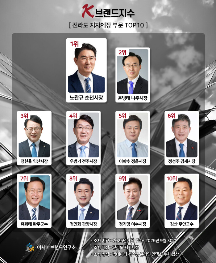 이번 K-브랜드지수 전라도 지자체장 부문은 전라도 지자체장을 대상으로, 2025년 9월 1일부터 9월 30일까지의 온라인 빅데이터 4931만 2200건을 분석했다.
