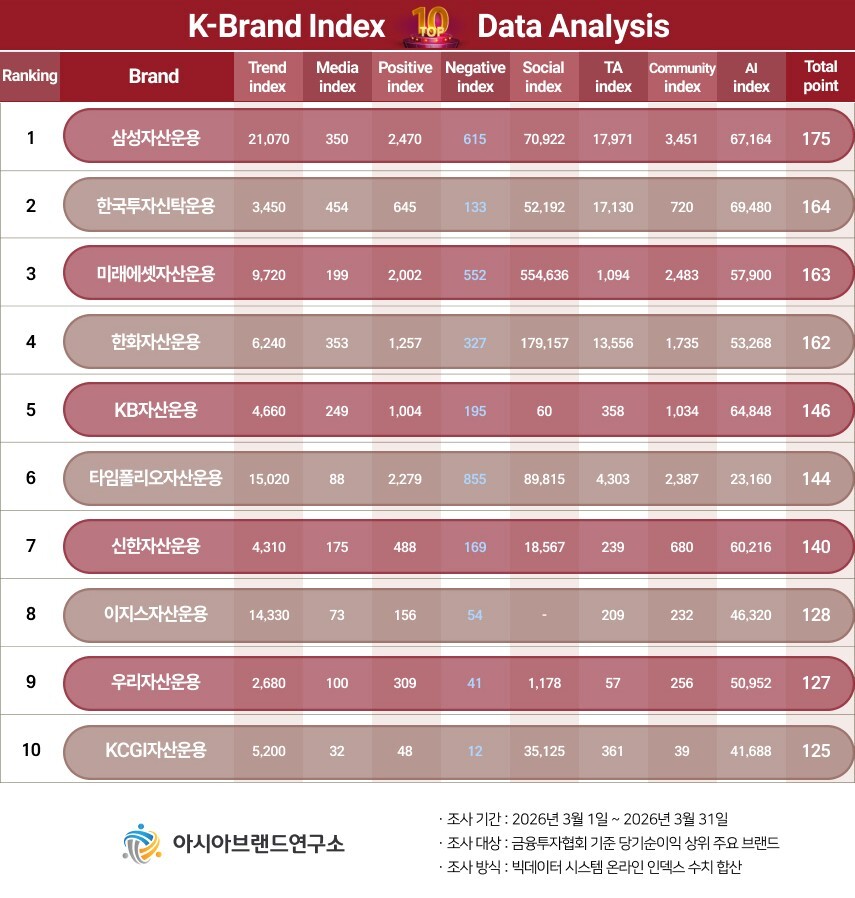 이번 K-브랜드지수 자산운용사 부문은 금융투자협회 기준 당기순이익 상위 주요 브랜드를 대상으로, 2026년 3월 1일부터 3월 31일까지의 온라인 빅데이터 222만 6325건을 분석했다.