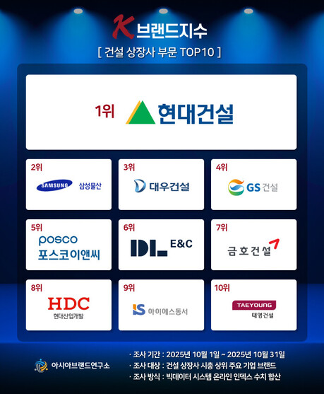 한정근 아시아브랜드연구소 대표는 “이번 K-브랜드지수 건설 상장사 부문은 현대건설이 삼성물산을 제치고 1위를 탈환하며 상위권 구도가 재편됐고, 포스코이앤씨와 아이에스동서의 TOP10 진입은 중견·엔지니어링 계열사의 브랜드 존재감이 강화되고 있음을 보여준다. 반면 일성건설과 동신건설이 TOP10 탈락은 빅데이터 브랜드 관리에 대한 중요성이 부각되는 상황”이라고 설명했다.