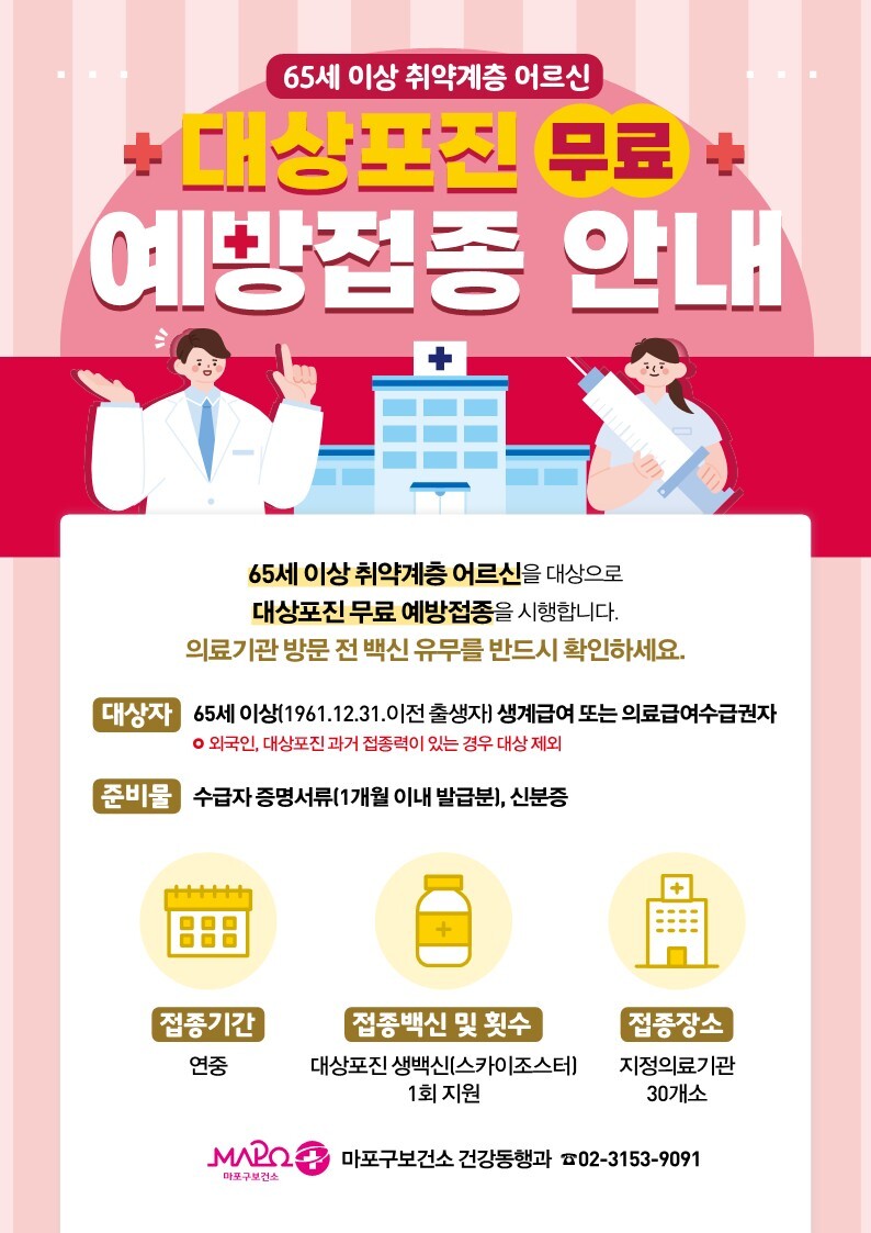 [HBN뉴스 = 정재진 기자] 마포구(구청장 박강수)는 지역 내 65세 이상 생계‧의료수급자 어르신을 대상으로 대상포진 무료 예방접종을 연중 시행한다.