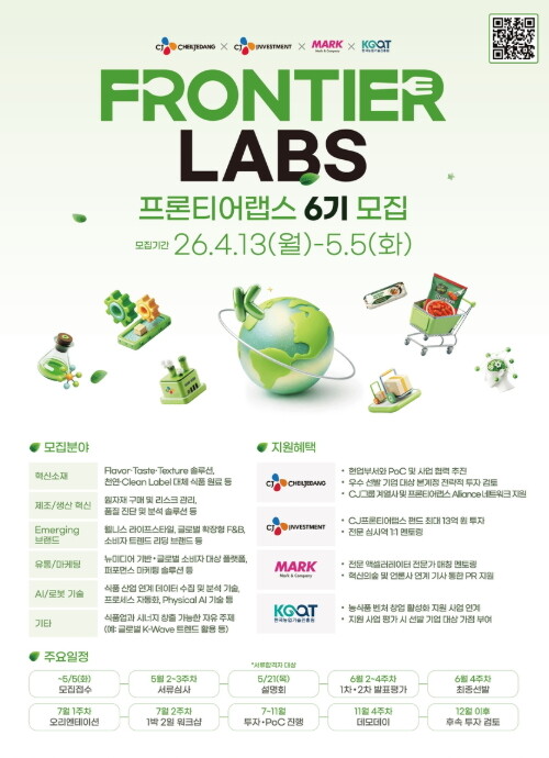 ‘프론티어랩스’는 CJ제일제당과 협업 가능한 혁신적인 기술과 아이디어를 보유한 농식품 분야 스타트업을 발굴해 투자하고 육성하는 프로그램이다. 모집 분야는 ▲식품 연계 AI·로봇 기술 ▲차세대 K-푸드 이머징(Emerging) 브랜드 ▲식품 유통·마케팅 플랫폼 ▲스마트 제조 및 생산 혁신 ▲대체 식품 및 지속 가능한 소재 등이다. 이 외에도 ESG, 기후테크 등 CJ제일제당과 함께 새로운 가치를 창출할 수 있는 사업 분야의 유망 스타트업은 누구나 지원할 수 있다. 모집 기간은 5월5일까지다.