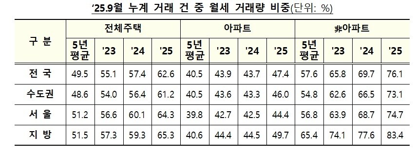 1∼9월 누계 기준 월세 비중은 2021년 43.0%에서 2022년 51.8%, 2023년 55.1%, 지난해 57.4%에 이어 올해 62.6%를 기록하며 계속 늘어나고 있다.