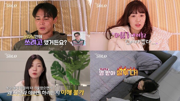 앞서 4일 차 ‘동시 선택’에서 영수는 순자에게 예고했던 대로 옥순을 선택했다. 영수의 선택을 받지 못한 순자는 이날 쓸쓸하게 숙소로 돌아가고, 옥순은 영수와 2시간 넘게 대화를 나눈다. 이후 옥순이 숙소에 들어서자, 순자는 재빨리 일어나 옥순을 피한다. 다음 날 아침, 순자는 영수가 여자 숙소를 찾아와 안마의자에서 마사지 중인 자신에게 “그러다 멍든다”고 농담해도, “이미 마음에 멍이 들어서 괜찮다”며 서운한 티를 팍팍 낸다. 잠시 후, 옥순이 등장하자 순자는 곧바로 2층으로 올라가 버리고, 영숙에게 “밑에 영수 님이랑 옥순 님이 있어서 너무 불편하다”고 토로한다.
