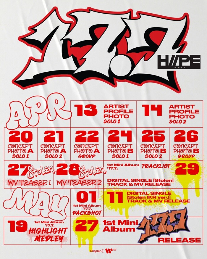 공개된 스케줄러는 앨범명 ‘17.7’을 중심으로 강렬한 비주얼을 완성했다. 레드, 블랙, 화이트 컬러가 어우러진 타이포그래피는 시선을 단번에 사로잡았고, 자유분방한 스트릿 감성을 직관적으로 담아냈다. 간결한 디자인 속에서도 팀이 지닌 당당한 에너지와 정체성이 자연스럽게 드러나며 데뷔 콘셉트에 대한 궁금증을 키웠다.