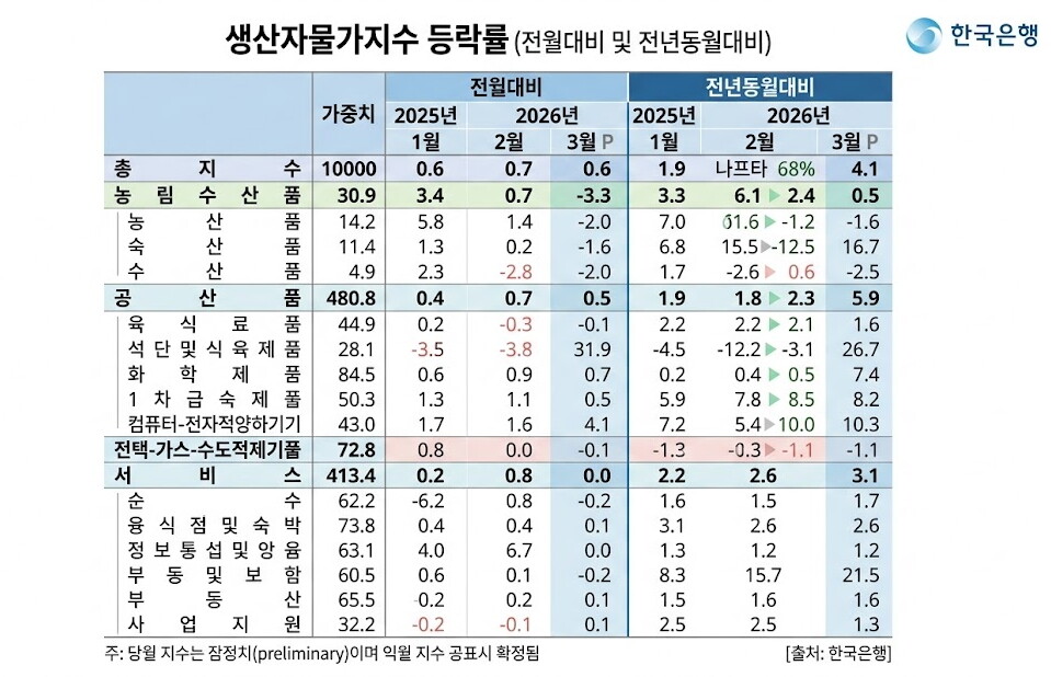 지난달 이란 전쟁 여파로 국제 유가가 급등하고 원유 수입도 발이 묶이면서 국내 생산자물가가 러시아·우크라이나 전쟁 발발 이후 약 4년 만에 가장 큰 폭으로 급등했다. 이러한 영향을 반영하듯 세부 품목에서 원유 파생 품목들인 나프타(68.0%), 경유(20.8%), 에틸렌(60.5%), 자일렌(33.5%) 등이 급등했다.