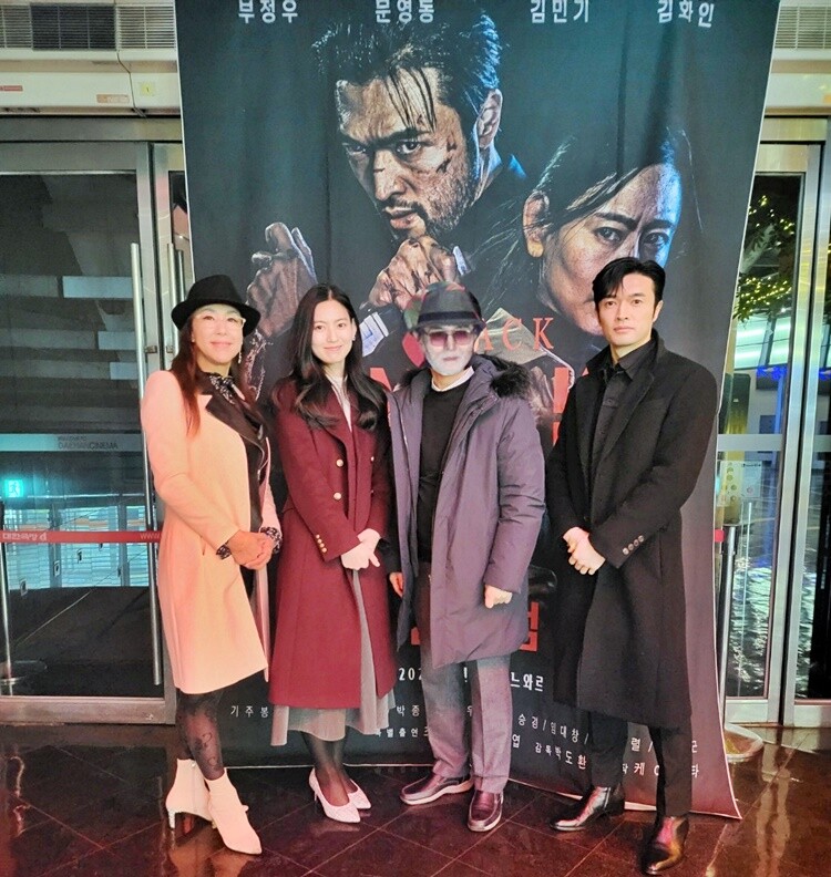 | 박도환 감독의 액션 영화 <검은뱀(BLACK SNAKE)>, OST '내머물곳은어디에' 가수 연가희 (左), 김화인 주연배우, 영화 제작사 장영수 대표, 부정우 주연배우(右) 지난 2일 시사회장에서 포스터를 배경으로 기념 촬영을 하고 있다. |
