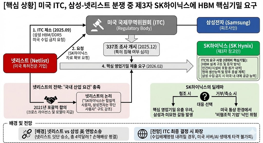 이후 ITC가 넷리스트의 신청을 받아들여 2026년 2월 SK하이닉스에 HBM 설계·원가·생산능력과 미국 내 대체 공급 능력 등 방대한 정보를 제출하라고 요구하면서, 과거 넷리스트와 합의했던 SK하이닉스까지 삼성전자의 ITC 특허 분쟁 한가운데로 다시 끌려 들어간 모양새가 됐다.