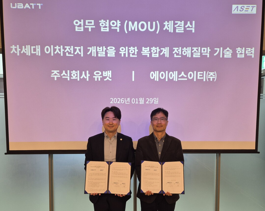 에이에스이티는 유뱃과 차세대 이차전지 핵심 소재 기술 협력을 위한 업무협약(MOU)을 체결했다고 4일 밝혔다.