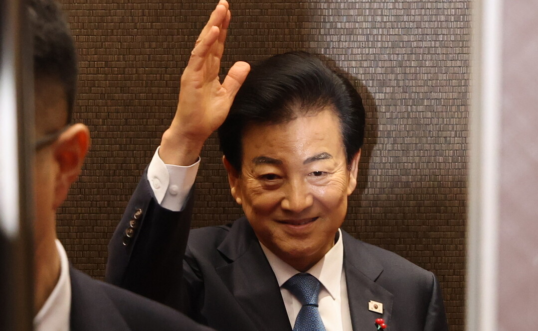 | 정동영 통일부 장관이 11일 서울 종로구 정부서울청사에서 집무실로 향하는 엘리베이터 안에서 손들어 인사하고 있다. [사진=연합뉴스] |