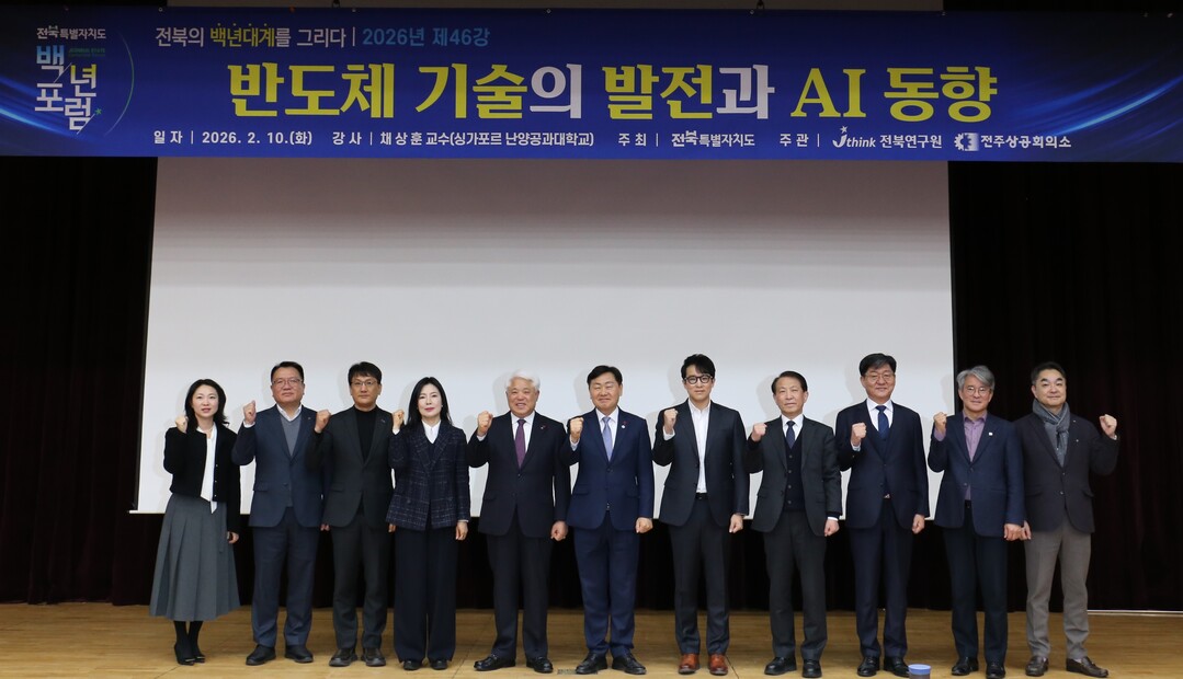 [HBN뉴스 = 이수준 기자] 전북연구원(원장 최백렬)은 10일 오전 전북특별자치도청 4층 대회의실에서 싱가포르 난양공과대학교 채상훈 교수를 초청해 ‘반도체 기술의 발전과 AI 동향’을 주제로 '전북 백년포럼'을 개최했다. 채 교수는 반도체 전문가로,지난 1월 ‘자랑스런 전북인상'을 수상했다.