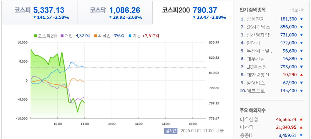 | 오전 11시 기준 코스피, 코스닥 지수. [이미지=네이버페이증권] |