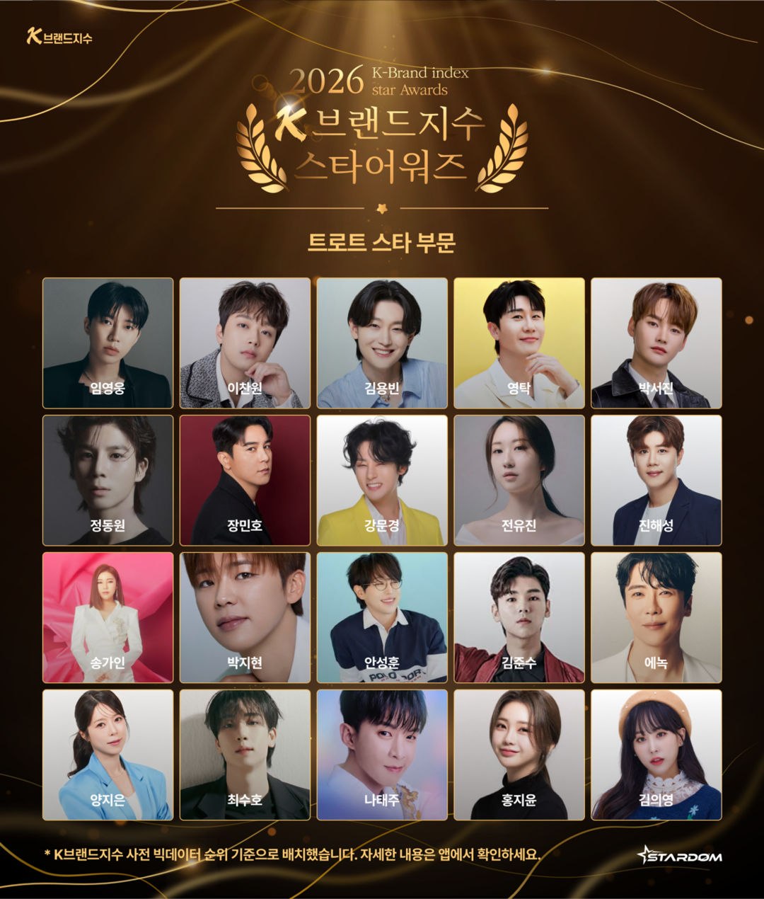[HBN뉴스 = 정동환 기자] K-브랜드지수와 STARDOM(스타덤)이 함께하는 ‘K-브랜드지수 스타 어워즈’가 트로트 스타 부문 투표를 시작한다. 이번 어워즈는 K-브랜드지수의 미디어·여론·검색 데이터 기반 ‘빅데이터 순위’와 STARDOM 팬 투표 결과를 결합해, 데이터의 신뢰성과 팬덤의 선택이 동시에 반영되는 방식으로 운영된다. K-브랜드지수는 아시아브랜드연구소가 개발한 빅데이터 시스템을 기반으로 하며, 지난해 10월부터 팬덤 투표 기반 ‘스타덤(STARDOM) 인덱스’를 공식 반영해 팬 참여 데이터를 브랜드 영향력 평가에 적용해왔다.