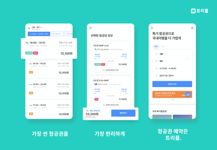 트리플은 지난 3월 국내선 항공 매출액이 올해 1월 대비 223% 증가하고, 예약자 수도 162% 증가했다고 21일 밝혔다. 항공권을 한 번 구매한 이후 다시 구매한 재구매자의 비율도 26%를 차지했다. 항공권은 가격이 가장 싼 곳을 찾아서 가격 비교 후 여러 예약 플랫폼을 이용하는 사용자들이 많음을 고려할 때, 트리플 항공을 이용한 구매자들의 만족도가 높은 것을 알 수 있다.
