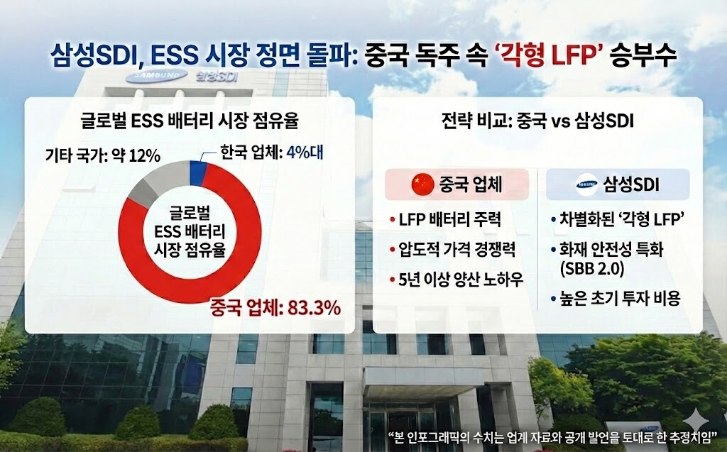 이러한 전망을 뒷받침하는 구체적인 성과도 나오고 있다. 삼성SDI는 지난해 12월 10일, 미주법인(SDIA)을 통해 미국 에너지 인프라 업체와 2조 원 규모의 ESS용 LFP 배터리 공급 계약을 체결했다. 이는 삼성SDI가 공들여온 LFP 배터리 포트폴리오의 실질적인 첫 대형 수주로, 오는 2027년부터 3년간 'SBB 2.0' 제품이 공급될 예정이다.