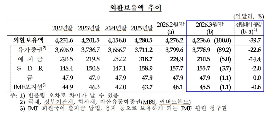 3일 한국은행에 따르면 3월 말 기준 우리나라 외환보유액은 4236억6000만달러(약 641조원)로, 전월(2월)에 비해 39억7000만달러 줄었다.