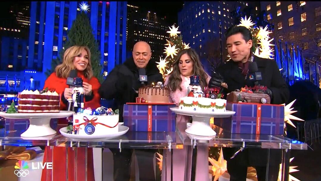 | 지난 3일(현지 시간) 미국 뉴욕 록펠러센터 크리스마스트리 점등식 NBC 생방송에서 진행자들이 파리바게뜨 홀리데이 시즌 케이크를 소개하고 있다. [사진=NBC 방송 캡쳐] |