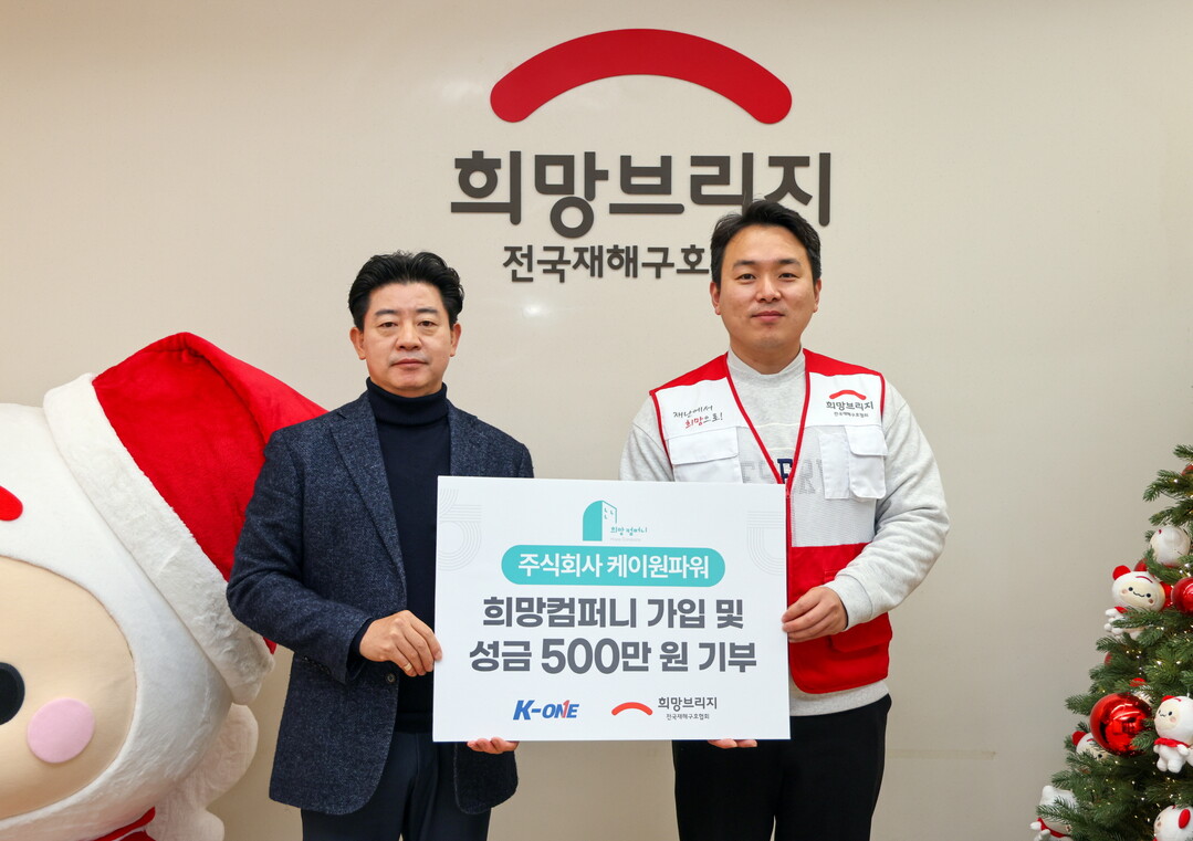 ㈜케이원파워는 이번 기부와 함께 재난 피해 이웃 지원을 위해 월 20만 원 이상을 약정하는 희망브리지의 정기 기부 캠페인 ‘희망컴퍼니’에 참여하며 나눔을 이어간다. 앞서 2024년에도 재난으로 어려움을 겪는 이웃을 돕기 위해 성금 300만 원을 기부한 바 있다.