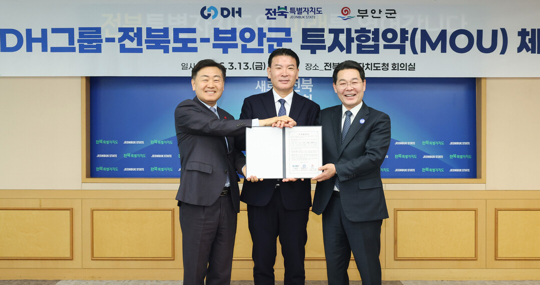 현대차그룹의 새만금 9조원 투자협약에 이어 DH그룹까지 전북 서부권 투자 대열에 합류하면서 첨단산업 벨트 구축에 속도가 붙고 있다고 전북도는 강조했다. DH그룹은 2026년부터 2032년까지 3단계에 걸쳐 총 1500억 원을 투자해 부안 제3농공단지를 피지컬AI·방산·수소 산업이 집약된 복합 제조기지로 고도화한다.