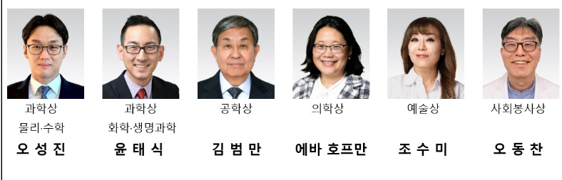 올해 수상자는 ▲과학상 물리·수학부문 오성진(37) 미국 UC버클리 교수 ▲과학상 화학·생명과학부문 윤태식(51) 美 위스콘신대 매디슨 교수 ▲공학상 김범만(79) 포스텍 명예교수 ▲의학상 에바 호프만(51) 덴마크 코펜하겐대 교수 ▲예술상 조수미(63) 소프라노 ▲사회봉사상 오동찬(58) 국립소록도병원 의료부장 등 6명이다.