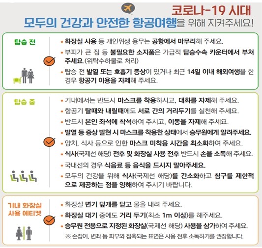 국토부는 안전한 항공교통 이용을 위해 승객들이 기내에서 마스크 착용, 대화자제, 좌석 이동금지, 화장실 사용 후 손 소독, 식음료 섭취제한 등 코로나19 감염예방을 위한 기내 에티켓* 준수와 함께 비행 중 승무원의 방역활동에도 적극 협조해 줄 것을 당부했다.