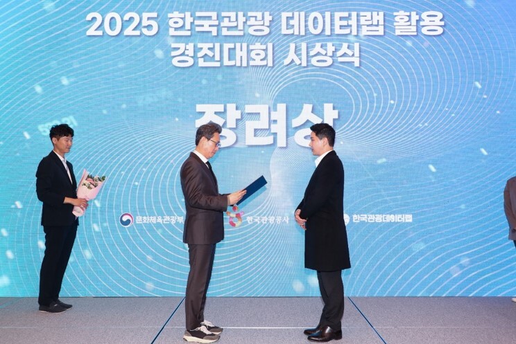 | (사진 왼쪽)한국관광공사 사장 직무대행 서영충, (사진 오른쪽)ENA스위트호텔 서울 총지배인 신용진 10월23일. 주최 문화체육관광부, 한국관광공사2025 한국관광 데이터랩 활용 대회에서 장려상을 수상했다 |