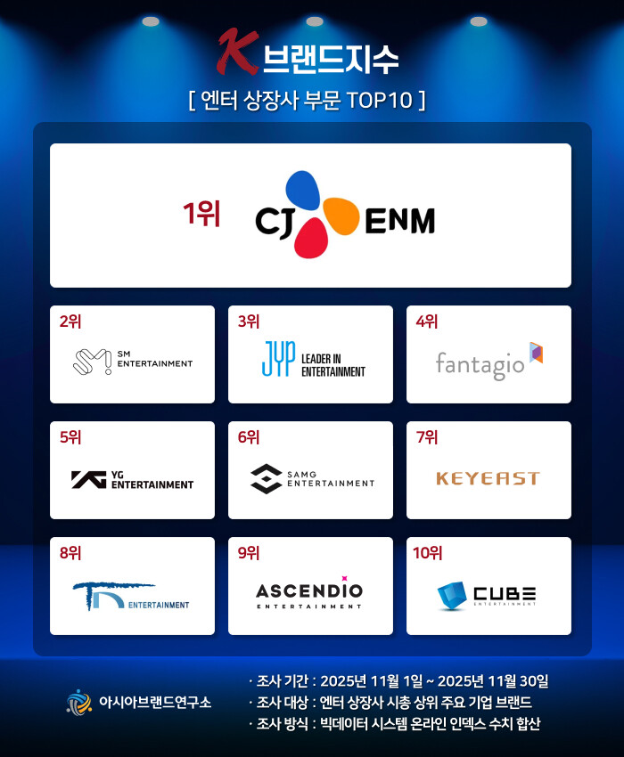 한정근 아시아브랜드연구소 대표는 “이번 K-브랜드지수 엔터 상장사 부문은 단순한 기업 규모보다 팬덤 반응의 밀도와 온라인 체감 화제성이 순위 변동을 이끌었다. CJ ENM과 에스엠이 선두권을 유지한 가운데, JYP Ent.의 재진입은 특정 시점에 집중된 팬덤 관심이 브랜드 밸류에 즉각 반영된 사례로 볼 수 있다”고 평가했다.