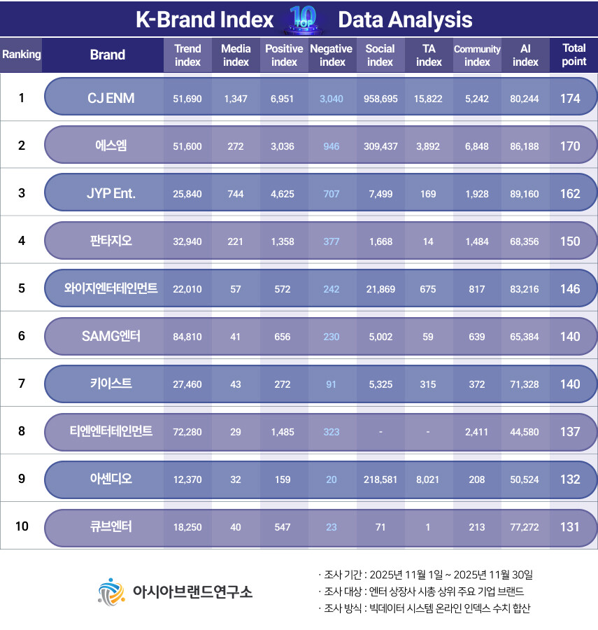 이번 K-브랜드지수 엔터 상장사 부문은 엔터 상장사 시총 상위 주요 기업 브랜드를 대상으로, 2025년 11월 1일부터 11월 30일까지의 온라인 빅데이터 414만 7654건을 분석했다.