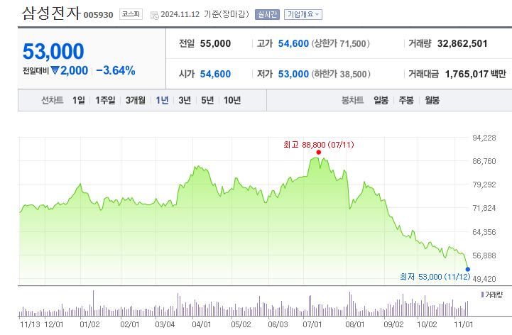 12일 삼성전자 주가는 전일보다 3.64%(2000원) 하락한 5만3000원으로 거래를 마쳤다. 전날 5만5000원에 마감하며 52주 최저가를 갈아치운 이후 하루 만에 신저가를 기록했고, 지난 7월11일 52주 최고가(8만8800)보다 무려 40%가 하락한 것이다.