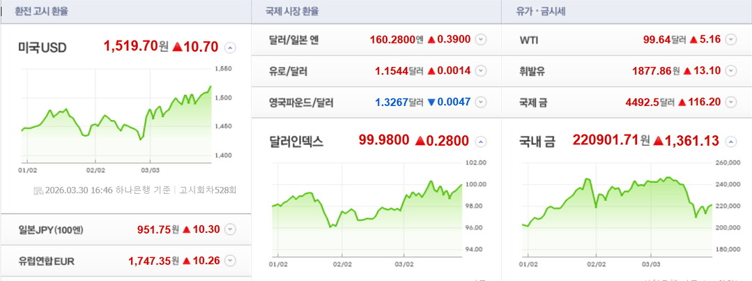 [HBN뉴스 = 이필선 기자] 원·달러 환율이 중동발 불안 지속에 30일 1520원을 넘어섰다. 환율이 1520원 위로 상승한 것은 글로벌 금융위기 당시인 2009년 3월 10일(장중 최고 1561.0원) 이후 17년여 만이다.