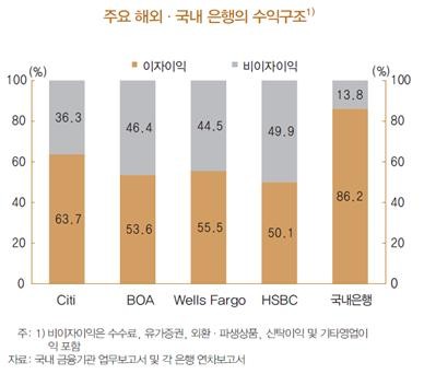 2020년 상반기 기준으로 은행의 총영업이익에서 이자이익이 차지하는 비중은 86.15%인데 비해 비이자이익은 13.85%에 불과하고, 총자산대비 비이자순수익 비율은 0.24% 수준으로 매우 낮다.