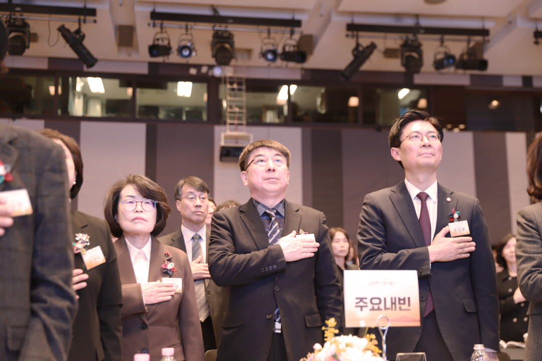 [HBN뉴스 = 정동환 기자] 한국보육진흥원이 5일 오후 한국프레스센터에서 2026년 영유아 보육·교육계 신년 인사회를 개최하였다. 한국보육진흥원 조용남 원장과 함께 교육부 영유아정책국 강민구 국장, 국회 교육위원회 간사 조정훈 의원(국민의힘)이 국민의례를 하고 있다.