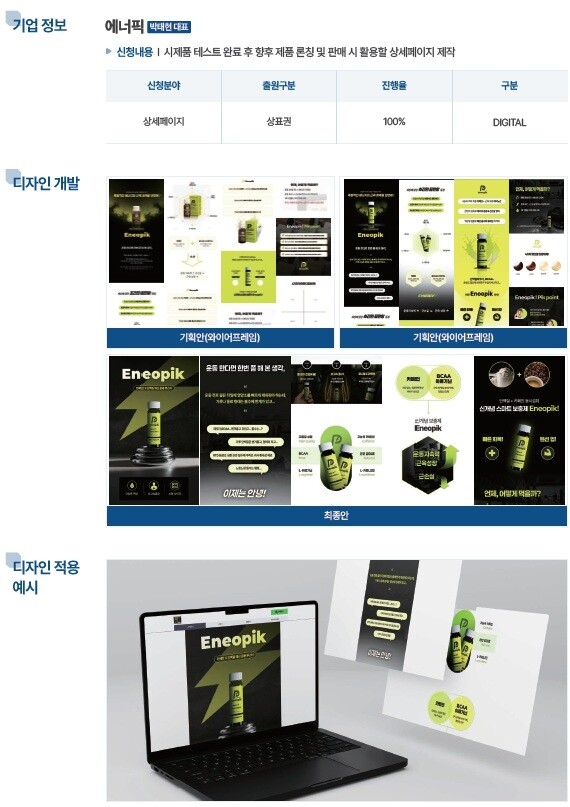 본 사업은 뛰어난 기술력을 보유하고도 디자인 역량 부족으로 시장 진입에 어려움을 겪는 중소기업을 대상으로 [브랜드 전략 수립 - 디자인 개발 - 시제품 제작 - 지식재산권 확보]의 전 과정을 체계적으로 지원하는 ‘디자인 기반 성장 모델’ 구축 사업이다.