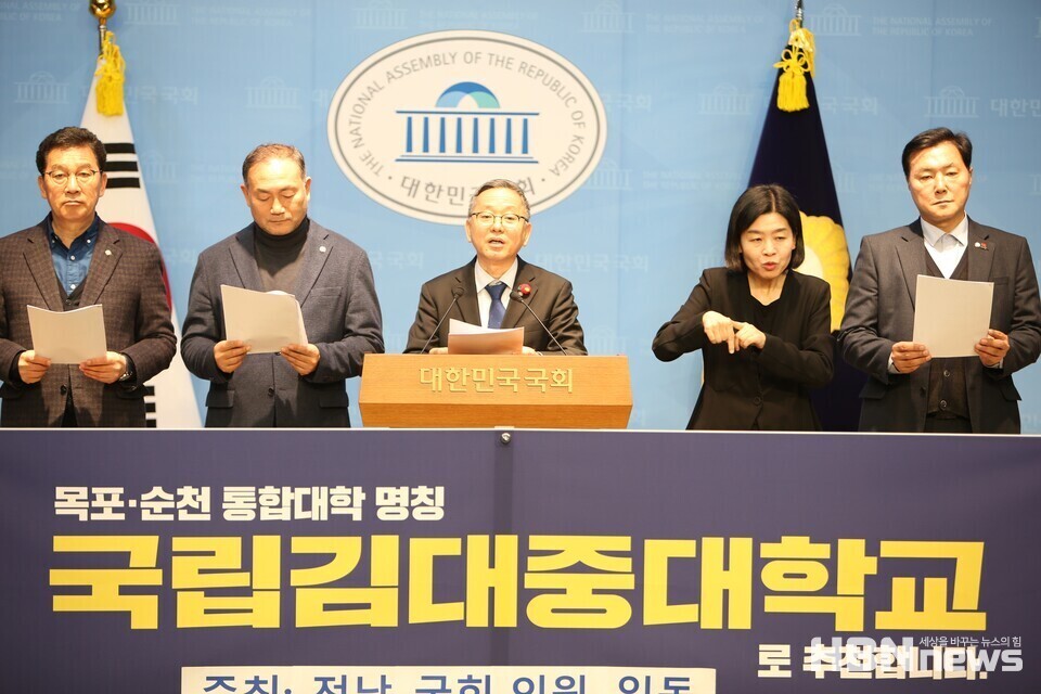 | △사진=더불어민주당 김원이·신정훈·김문수·조계원 등 전남지역 국회의원들이 9일 국회에서 기자회견을 열고 전남 통합대 국립의대 명칭으로 ‘국립김대중대학교’를 공식 제안했다. ⓒHBN뉴스 |