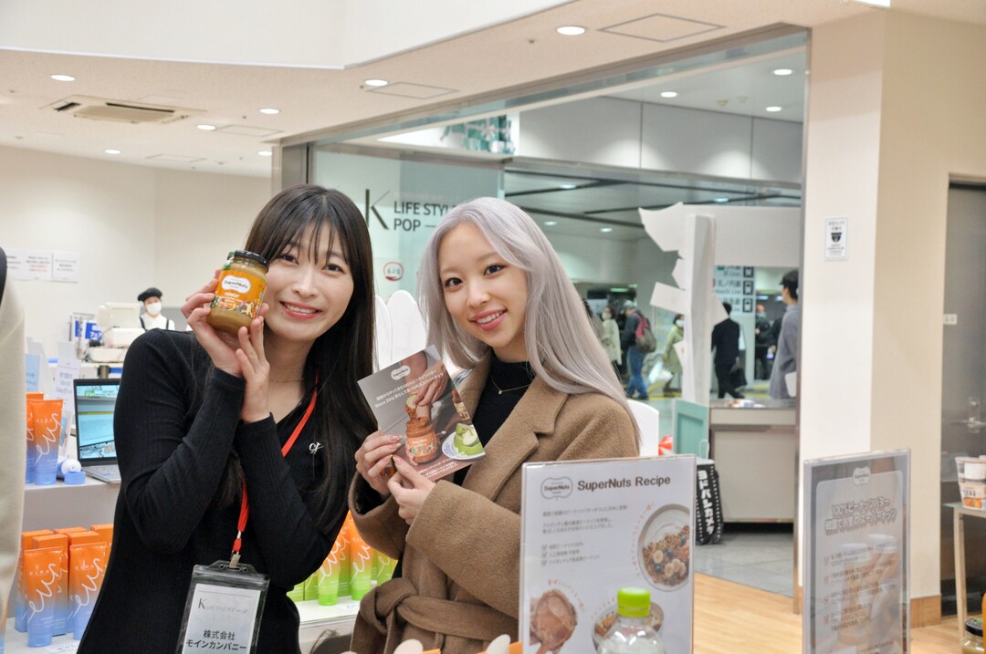| 게이오백화점 팝업스토어 슈퍼너츠 부스를 방문한 일본 유명 인플루언서가 제품을 둘러본 뒤 기념촬영을 하고있다.ⒸHBN뉴스 |