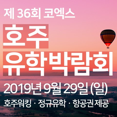 9월29일 삼성역 코엑스에서 호주유학, 호주어학연수 박람회가 열린다. 호주어학연수 전문 호주프로모유학이 주최하는 이번 박람회는 등록 시 최대 50% 학비 할인 및 학비 카드 결제 가능, 호주 항공권, 필리핀어학연수 연계연수 무료, 초기 정착 서비스 무료 등의 혜택이 제공될 예정이다.