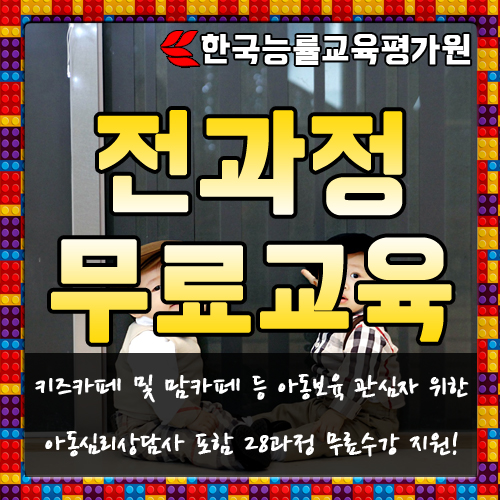 한국능률교육평가원(한능평) 평생교육원에서는 보육교사자격증과 육아종합지원센터, 키즈카페·맘카페 등에 관심 있는 이들에게 아동정서안정과 육아교육법을 배워볼 수 있는 아동심리상담사, 놀이심리상담사, 방과후지도사 등 28종 자격증종류에 대해서 사회공헌·재능기부일환으로 마련된 온라인무료교육 이벤트를 누구에게나 전폭적으로 지원하고 있다고 밝혔다.