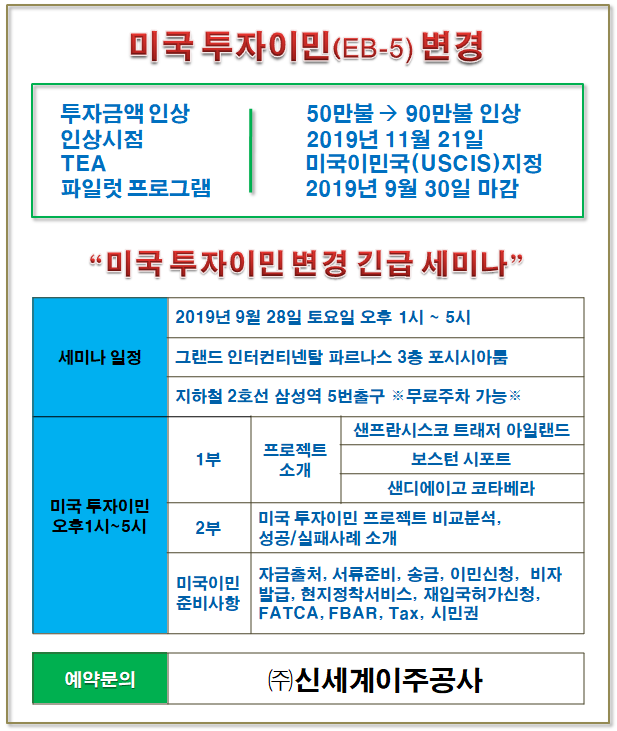 미국 투자이민에 대한 더 자세한 내용은 9월 28일(토) 그랜드 인터컨티넨탈 호텔에서 개최되는 미국 투자이민 긴급 세미나에서 확인 가능하며, 예약자에 한해 입장료와 주차비가 모두 무료다. 세미나 참가 관련 사항은 ㈜신세계이주공사 홈페이지에서 확인 가능하다.