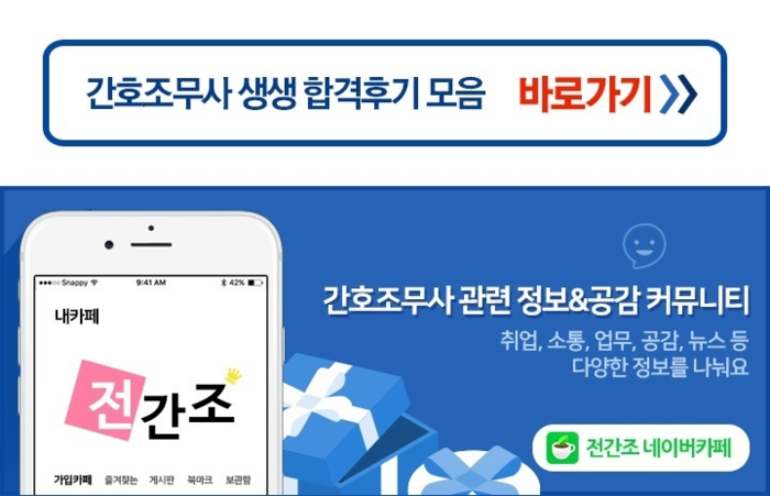 한편 전간조는 전국의 간호조무사 약 15만명이 활동하는 네이버 대표카페로, 이곳과 대한간호조무사협회, 부산간호조무사협회를 통해 간호조무사 시험시간, 응시 적정 나이 등 간호조무사 시험과 관련된 유익한 정보들을 얻을 수 있다.