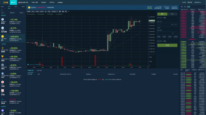 하지만, EXX에서 KRWT마켓 오픈 공식발표를 하면서 ET코인을 기존보다 쉽게 거래 할 수 있는 호재 소식에 국내 이용자 및 투자자들의 수요가 폭발적으로 늘어나면서 ET코인은 연일 강한 상승추세를 보이고 있다.