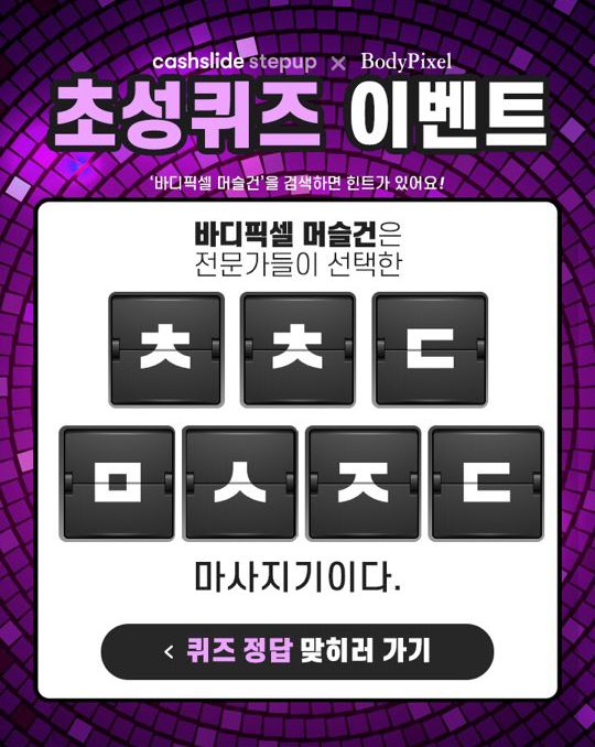 바디픽셀 관계자는 “바디픽셀 머슬건이 최근 연예인, 유튜버 등은 물론 전문 트레이너들 사이에서 인기를 얻고 있다 ” 고 전하며 “ 많은 성원과 관심으로 이와 같은 캐시슬라이드와 함께 초성퀴즈를 준비했다. 감사 이벤트도 준비한 만큼 많은 관심과 성원 바란다”고 밝혔다.