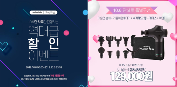 바디픽셀 머슬건을 최대 39% 할인에 기존 4종에서 6종으로 변경된 추가헤드와 새로 출시된 케이스가 구성되어 제일 먼저 만나볼 수 있다고 전했으며, 추가적으로 3천원 즉시 적립 이벤트 및 무료 배송도 가능하다.