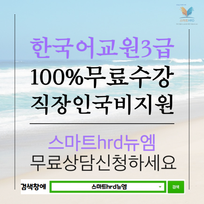 한국어교원자격증 3급 등 다양한 직장인 국비지원 무료인강에 관련된 자세한 내용은 포털 사이트에 ‘스마트hrd뉴엠’ 검색 후 온라인 무료상담 또는 전화상담을 통해 안내받을 수 있다.