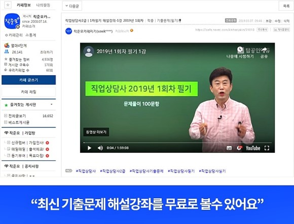 네이버카페 ‘직준모’(‘직업상담사 시험을 준비하는 사람들의 모임’)가 스타강사 김덕희의 2019년 직업상담사2급 자격증 필기/실기 시험대비 기출해설/모의고사인강 전과정을 무료로 선보이고 있다.